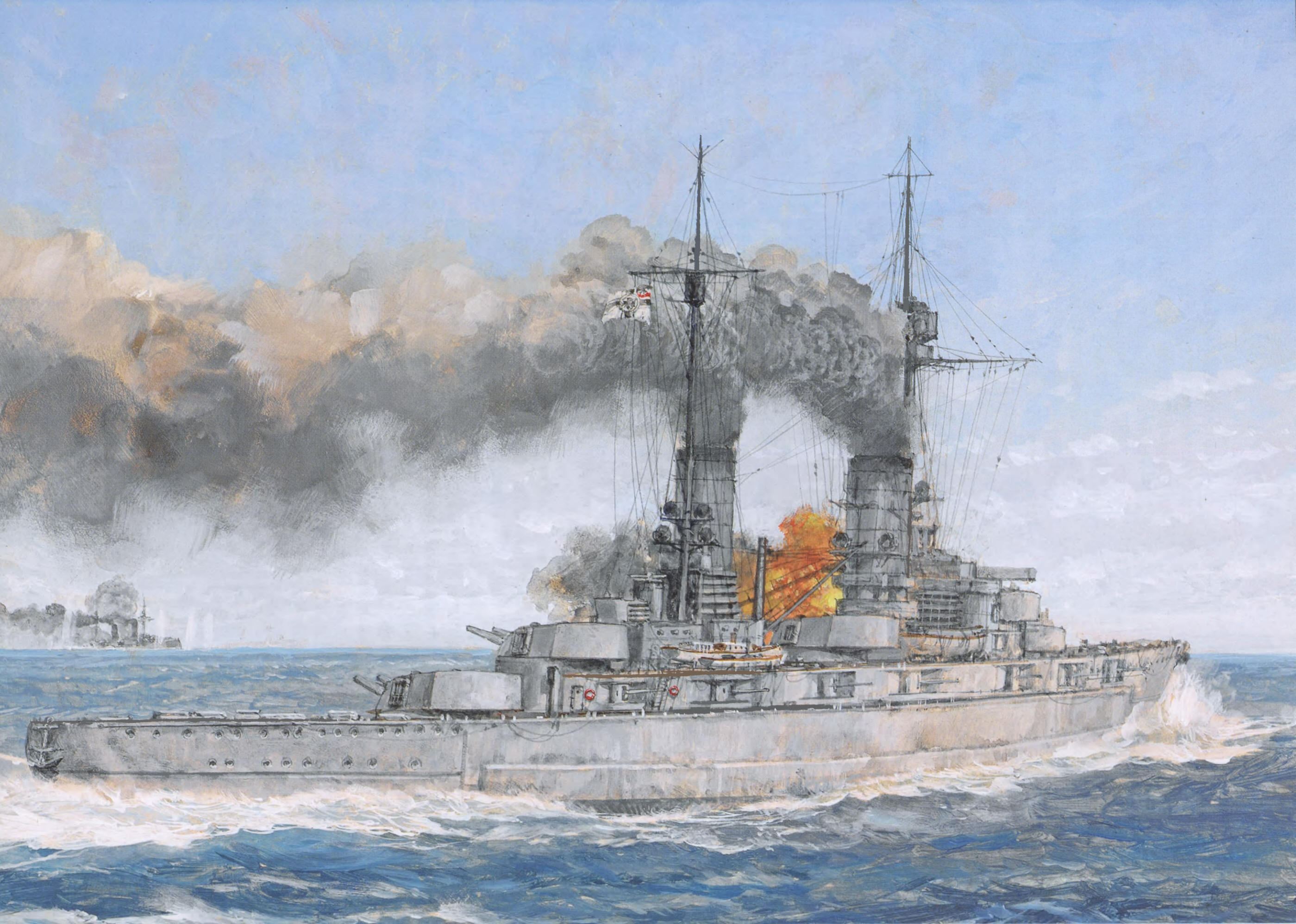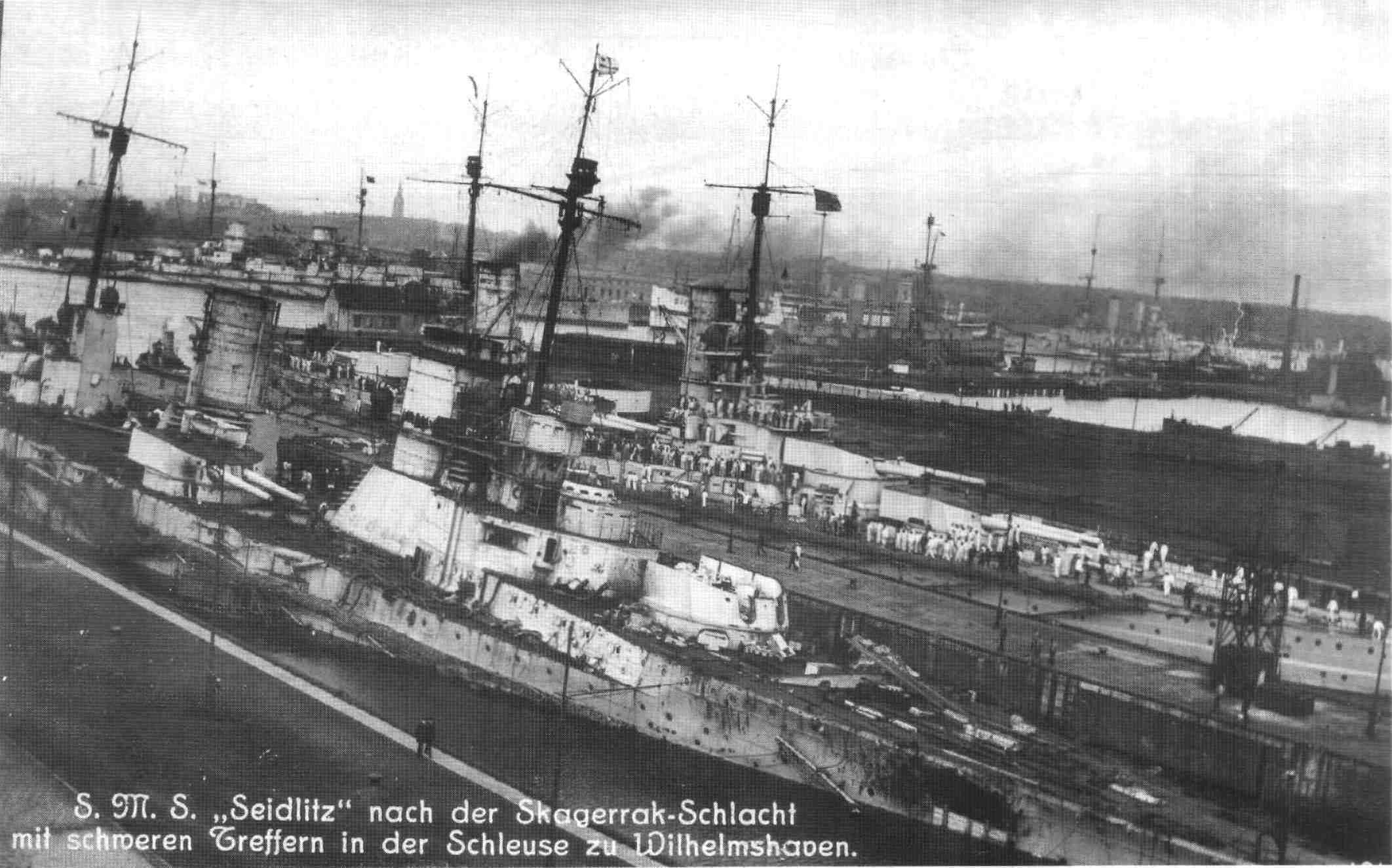От одного попадания вышла из строя (одна) кочегарка (вероятно, левого борта). Три следующих 381-мм полубронебойных снаряда ударили почти одновременно в носовую часть; один из них задел верхнюю кромку командного пункта, другой попал в переднюю 355-мм броневую плиту и, не пробив ее, рикошетировал. Третий снаряд попал в бак, но также отскочил и затем разорвался, не принеся существенных повреждений. Бортовые коридоры и угольные ямы левого борта в разных местах были затоплены водой, так что для возвращения корабля на ровный киль пришлось затоплять противоположные отделения правого борта. Осколками снарядов были повреждены грот-мачта и прожекторы, расположенные на площадках за второй трубой, а также броневые марсы. Потери экипажа составили 72 человека. Корабль принял 1600 т воды; "König" возвратился в базу без посторонней помощи и встал в ремонт, закончившийся 21 июля 1916 г. Итоги. За 1 час 36 минут боя "König" получил десять 381 -мм. полубронебойных лиддитовых снарядов, большинство которых попало в носовую часть корабля по левому борту, причинив большие разрушения в надводной и подводной частях "König".