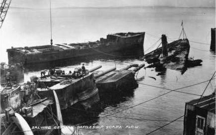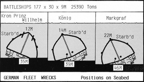 Согласно Брайеру, в 1936 г.; по Грёнеру, 29 апреля 1938 г. англичане подняли единственный линкор типа "König" - "Großer Kurfürst", а затем на верфи в Розайте его корпус разобрали на металл. В дальнейшем право на подъём кораблей для разделки на металл британское Адмиралтейство не разрешало выкупить вплоть до 1962 г., когда продали права на подъём разным фирмам. Одна шотландская фирма выкупила право на разделку на металл корпуса "König". Корпус корабля целиком не поднимали, но наиболее ценные материалы и никельсодержащие броневые плиты демонтировали и подняли на поверхность. Одна британская фирма выкупила у Адмиралтейства право на разделку корпуса "Markgraf" на металл под водой. Сам корабль целиком не поднимали, но в том же году наиболее ценные металлы и никельсодержащие броневые плиты демонтировали и подняли на поверхность. Одной шотландской фирме, выкупившей право у Адмиралтейства на разделку на металл под водой корпуса "Kronprinz Wilhelm", удалось путём демонтажа корпуса под водой поднять на поверхность только наиболее ценные металлы.