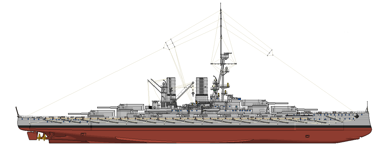 Первый, мощностью 60 л.с., питался от мотор-генератора в 90 кВт, по схеме Вард-Леонарда. Каждая башня могла работать от любого из двух генераторов, находящихся в разных помещениях. Вспомогательный электродвигатель для наводки (шунтовый, мощностью 8,4 л.с.), мог работать от главной или вспомогательной электропроводки, проходящей в башню. Гидравлическая энергия вырабатывалась двумя трехплунжерными насосами, каждый насос приводился непосредственно сцепленным с ним шунтовым электродвигателем в 150 л.с. Получаемая таким путём энергия использовалась для вертикальной наводки орудий, для подъёма боезапаса по главным элеваторам, для подачи зарядов, для прибойников и для управления затворами орудий (все эти операции имели и дублированный ручной привод). Для главных элеваторов боезапаса имелся и вспомогательный ручной привод (сериес-мотор, работающий в качестве генератора при опускании подъемника). Опорой вращающейся части установки служил жёсткий барабан, имеющий в плане форму восьмигранника, чётные грани которого представляли собой не отрезки прямой, а фрагменты дуги описанной вокруг этого восьмиугольника окружности. Этот барабан склёпывался из 25мм листов в два слоя и усиливался рёбрами жёсткости (высотой 200 мм и толщиной 10 мм), отстоявшими друг от друга на расстояние 980 мм. Стальной настил верхней палубы проходил через броню барбетов первой, второй и третьей башен и крепился к жёсткому барабану, а в четвёртой установке настил под башенным погоном был выведен наружу и крепился к барбетной броне. Жёсткие барабаны устанавливались на средней палубе и основной опорой для них служили поперечные и продольные переборки, установленные на настил двойного дна. 15" снаряды линкора складировались в погребах на специальных стеллажах, причём укладка производилась поперёк корабля. Погреба были достаточно просторны, к стеллажам имелся свободный доступ. Помещение вокруг подачной трубы, при отсутствии в этом месте герметического закрытия от пламени, почти полностью было занято снарядной платформой. Участки палуб, смежные с отсеками, где имелась высокая температура (машинные и котельные отделения), и переборки, примыкающие к угольным ямам, обшивались деревом. Вокруг погреба были проложены трубы охлаждения. Снарядный погреб мог быть затоплен забортной водой через спринклерную систему, расположенную над стеллажами и погрузочными лотками. При погрузке снарядов в погреба они опускались вниз посредством специального устройства с электроприводом. Дойдя до погреба, податчик со снарядом останавливался, приводился в горизонтальное положение и разгружался. Согласно последующей оценке англичан, это устройство "...остроумно и хорошо работает, но весьма сложно и некомпактно". Вокруг подачной трубы специальной подачной камеры не предусматривалось, заряды хранились в центральном помещении и непосредственно подавались к подачной трубе. Это помещение не было защищено от форса огня сверху в моменты открытия створок загрузочной дверцы в подачной трубе, через которую подавались заряды. При использовании боковых погребов они также оказывались открытыми со стороны центрального помещения. По наружному периметру каждой группы погребов башен (и носовой, и кормовой) зарядные погреба также обшивались деревом. Охлаждение погребов производилось посредством 