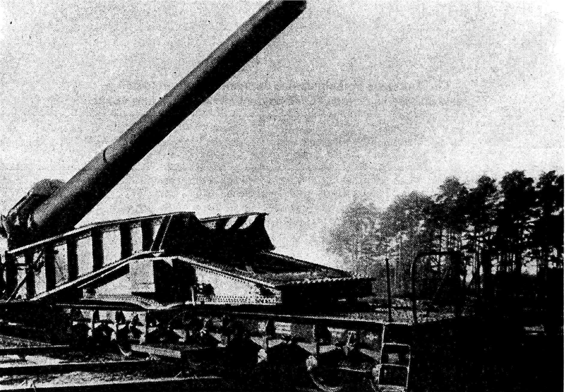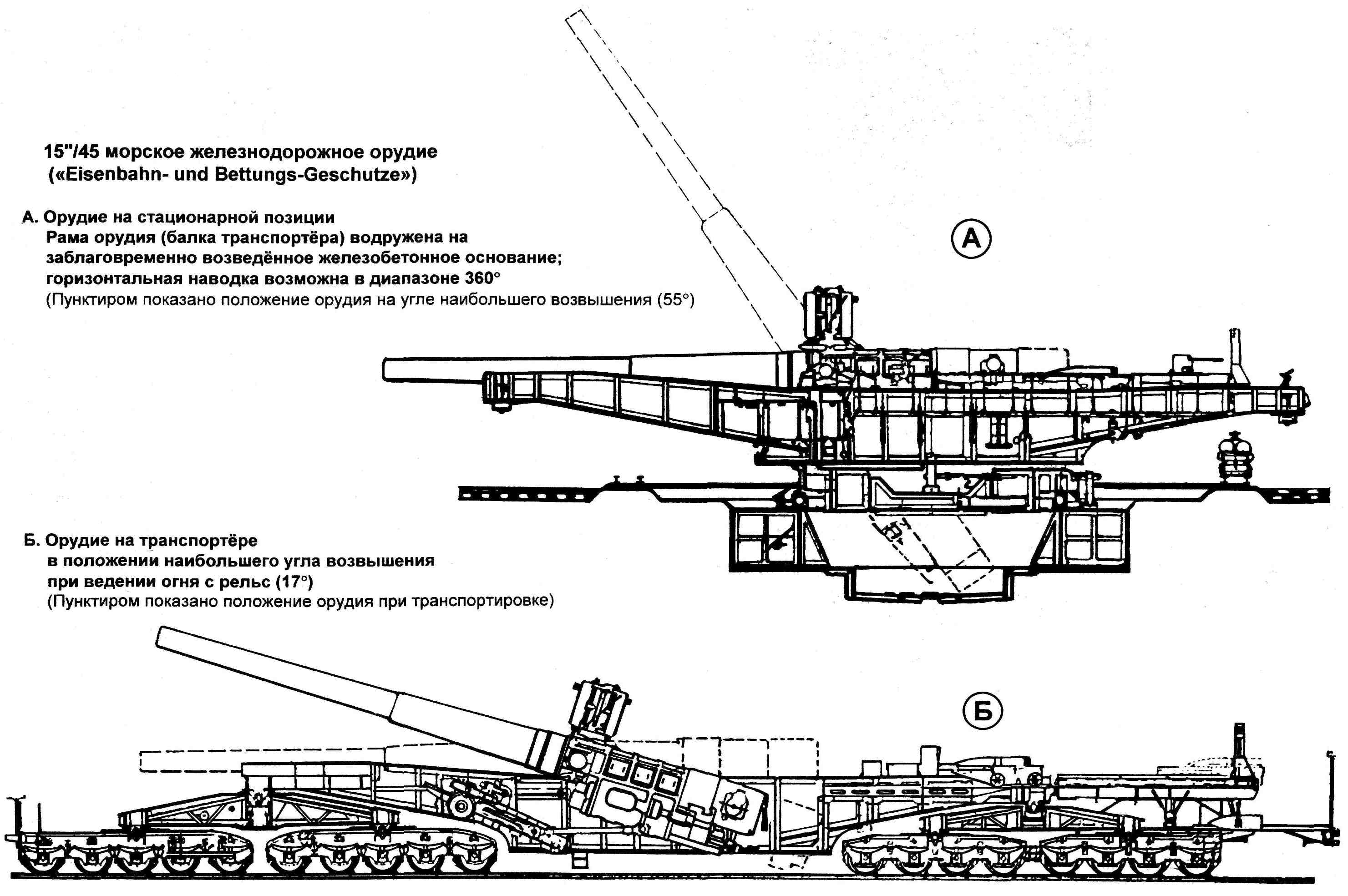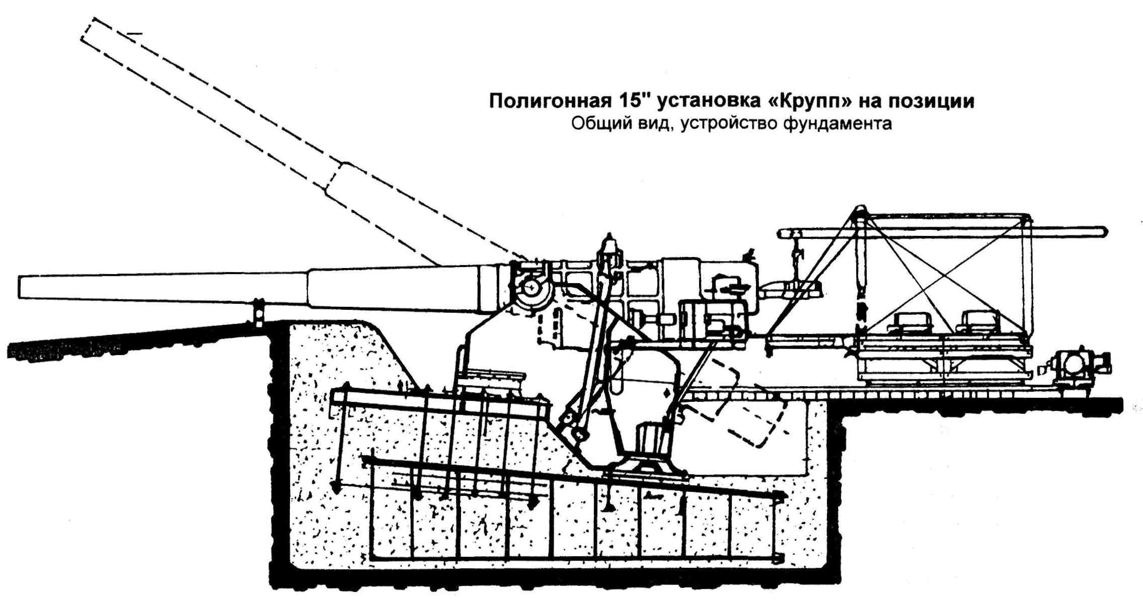 Установки на стальных сборно-разборных основаниях Задача повышения мобильности стационарной тяжёлой артиллерии была решена фирмой "Крупп" путём создания сборно-разборных стальных оснований, которые могли относительно быстро возводиться в требуемом месте и также быстро демонтироваться по мере минования надобности. Заказ на два первых сборно-разборных основания для 15" орудий был выдан компании весной 1916 г. Основание состояло из центрального узла, несущего поворотный штырь установки, и из кругового сектора наведения, представлявшего собой фрагмент дуги окружности, соединявшегося с центром посредством радиальных балок. Это основание могло набираться из двух, четырёх, шести или восьми подобных балок, так что угол горизонтальной наводки в этом случае изменялся в пределах от 33° до 360°. Два первых передвижных основания из заказанных имели по четыре радиальных балки, и сектор горизонтальной наводки каждой из них составлял по 132°. Третья подобная установка была заказана в сентябре 1916 г. и смонтирована впервые в ноябре 1916 г. на огневой "позиции №Х1" у Эпеи. Все эти установки интенсивно и с большим успехом использовались в течение 1917 г. на Западном фронте. В расчёт времени по возведению подобных позиций, монтажа на них орудий и их подготовки к стрельбе были положены следующие соображения: прокладка железнодорожной ветки — десять дней с момента срезки первого дёрна, подвозка и монтаж 150-тонного козлового крана — три дня, отрывка котлована, планировка площадки -— 16 дней после начала работ, установка орудия и подготовка его к стрельбе — 35 дней после начала всех работ. Для перевозки всего комплекта частей установки требовалось 38 железнодорожных вагонов. Монтаж производился под наблюдением трёх специалистов фирмы "Крупп", всю же неквалифицированную рабочую силу представляли солдаты. Помимо этих 15" орудий, было изготовлено ещё одно орудие, обозначаемое в документах как "35/38см". Один из 15" расстрелянных стволов был переделан вставкой в его канал 14" нарезной внутренней трубы. Получившийся ствол был срезан у дула, поскольку требовалось отнесение его центра тяжести ближе к казенной части. В итоге ствол переделанного орудия имел длину лишь 37J5 калибров (13125 мм). Первоначально это орудие использовалось на "позиции №Х1" у Эпеи, затем было перевезено в мае 1917 г. на "позицию №ХШ" у Санкура и, наконец, в октябре 1917г. на "позицию №XIV" у Сайта. Никаких изменений в конструкции установки не потребовалось.