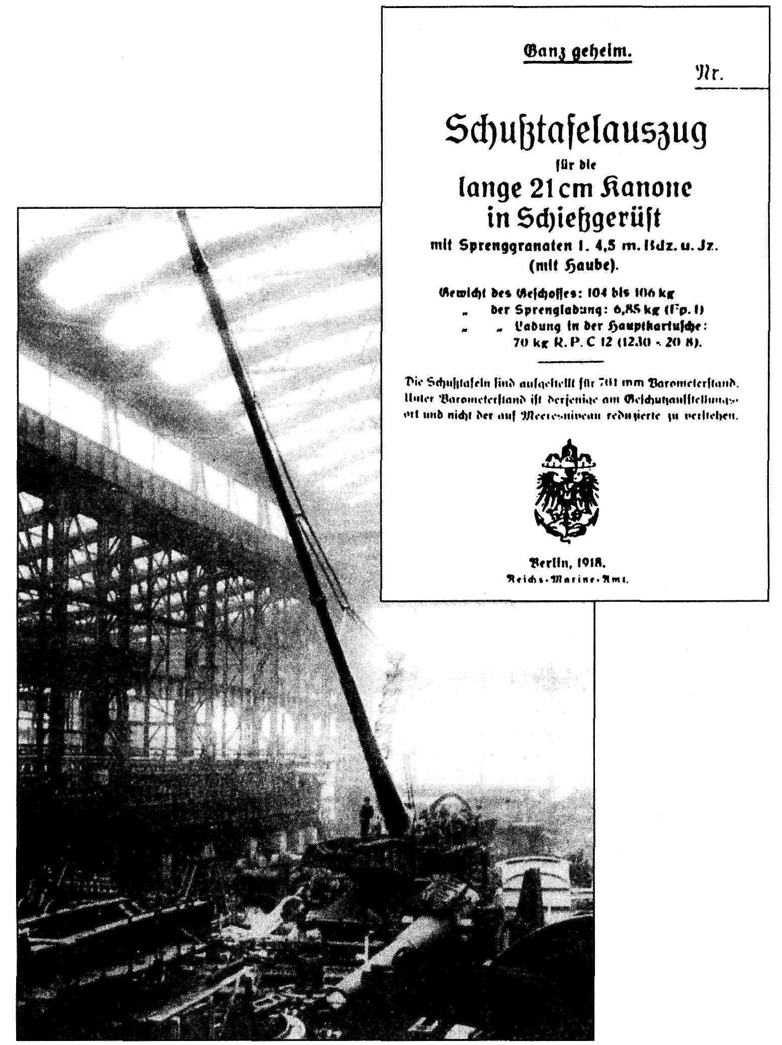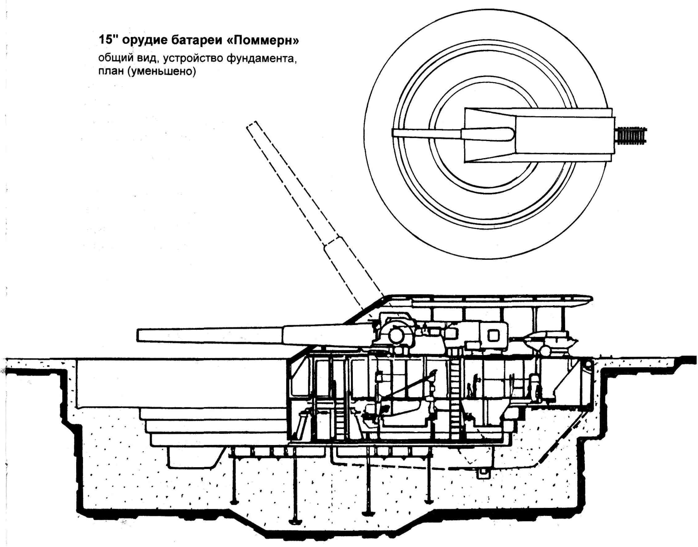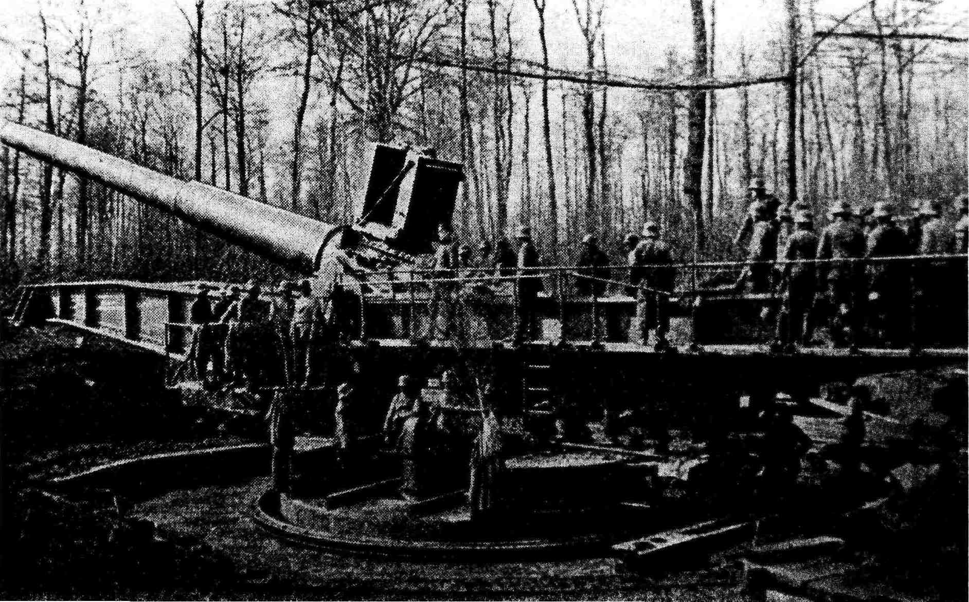 Установки на стальных сборно-разборных основаниях Задача повышения мобильности стационарной тяжёлой артиллерии была решена фирмой "Крупп" путём создания сборно-разборных стальных оснований, которые могли относительно быстро возводиться в требуемом месте и также быстро демонтироваться по мере минования надобности. Заказ на два первых сборно-разборных основания для 15" орудий был выдан компании весной 1916 г. Основание состояло из центрального узла, несущего поворотный штырь установки, и из кругового сектора наведения, представлявшего собой фрагмент дуги окружности, соединявшегося с центром посредством радиальных балок. Это основание могло набираться из двух, четырёх, шести или восьми подобных балок, так что угол горизонтальной наводки в этом случае изменялся в пределах от 33° до 360°. Два первых передвижных основания из заказанных имели по четыре радиальных балки, и сектор горизонтальной наводки каждой из них составлял по 132°. Третья подобная установка была заказана в сентябре 1916 г. и смонтирована впервые в ноябре 1916 г. на огневой "позиции №Х1" у Эпеи. Все эти установки интенсивно и с большим успехом использовались в течение 1917 г. на Западном фронте. В расчёт времени по возведению подобных позиций, монтажа на них орудий и их подготовки к стрельбе были положены следующие соображения: прокладка железнодорожной ветки — десять дней с момента срезки первого дёрна, подвозка и монтаж 150-тонного козлового крана — три дня, отрывка котлована, планировка площадки -— 16 дней после начала работ, установка орудия и подготовка его к стрельбе — 35 дней после начала всех работ. Для перевозки всего комплекта частей установки требовалось 38 железнодорожных вагонов. Монтаж производился под наблюдением трёх специалистов фирмы "Крупп", всю же неквалифицированную рабочую силу представляли солдаты. Помимо этих 15" орудий, было изготовлено ещё одно орудие, обозначаемое в документах как "35/38см". Один из 15" расстрелянных стволов был переделан вставкой в его канал 14" нарезной внутренней трубы. Получившийся ствол был срезан у дула, поскольку требовалось отнесение его центра тяжести ближе к казенной части. В итоге ствол переделанного орудия имел длину лишь 37J5 калибров (13125 мм). Первоначально это орудие использовалось на "позиции №Х1" у Эпеи, затем было перевезено в мае 1917 г. на "позицию №ХШ" у Санкура и, наконец, в октябре 1917г. на "позицию №XIV" у Сайта. Никаких изменений в конструкции установки не потребовалось.