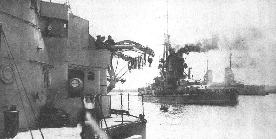 BadenВ общем, проигрыш войны уже ясно чувствовался всеми — от кайзера Вильгельма до разнорабочего на верфи, полночи вынужденного простаивать в очередях на получение эрзац-жиров и ничтожной порции хлеба с отрубями. Понимали это и германские адмиралы, планировавшие последний поход Флота Открытого моря против более чем вдвое сильнейшего англо-американского флота. Но кайзеровские морские стратеги хотели использовать перспективу страшных потерь, которые неминуемо должны были понести союзники в жестоком отчаянном сражении с великолепным германским противником, для торговли за смягчение условий перемирия, неотвратимость которого уже висела в воздухе. BayernВ 10 час. вечера 29 октября, за два часа до запланированного выхода в море, вахтенный офицер "Baden", на котором в этот момент командующий Флотом Открытого моря Хиппер проводил последнее совещание перед походом, доложил ему об отказе III линейной эскадры выполнять приказания. К тому же едва ли не самую большую опасность для планов командования таили и настроения в кубриках самого "Baden", матросы которого волновались и угрожали, что сверхдредноут, этот бронированный плавающий командный пункт германской армады, в море не выйдет. В полночь, на которую было назначено выступление, поступил новый доклад — о бунте команд на линкорах Großer Kurfürst, Helgoland и Thuringen. Хиппер был вынужден отложить выход в море на сутки. Однако и на следующий день порядок на дредноутах не был водворён. Утром 31 октября германский командующий решился на крайние меры. Мятежный Thuringen был взят в клещи двумя эсминцами и подводной лодкой U-135, подошедшей на дистанцию торпедного залпа. И хотя Helgoland сделал попытку прийти на помощь собрату, наведя свои 150-мм орудия на эсминцы и лодку, противостояние для восставших матросов кончилось неудачей — высадившиеся на борт Thuringen две сотни морских пехотинцев загнали восставших на бак, где те капитулировали по прошествии двух минут после предупреждения о том, что по ним будет открыт огонь. Спустя несколько минут сдались и восставшие на Helgoland. Более 500 человек из команд обоих линкоров было арестовано.