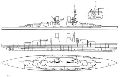 Интересно, что ступенчатому, одна поверх другой, расположению трёх установок главного калибра, так и не суждено было появиться ни на одном реально построенном линкоре-дредноуте ни до этого, ни впоследствии, хотя недостатка в подобных предложениях не было. Впервые три башни уступами появились в эскизных проектах знаменитого "Dreadnought" ещё в декабре 1904 г. - в вариантах Е (по три 12" двухорудийных установки в носу и корме) и F (две в носу и три в корме). Позднее новый импульс этой идее был сообщён уже под влиянием вашингтонских ограничений по тоннажу линкора (35000 т). В Англии и США в период 1929-1936 гг. было создано около трёх десятков проектов линейных кораблей, 14"-16" артиллерия которых размещалась в носовой половине уступами в трёх двух-, трёх- или четырёхорудийных башнях.