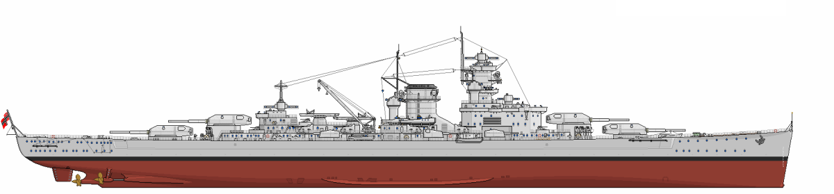 В июне 1942 г. корабль получил более полную маскировочную окраску для стоянки в норвежском фиорде. Надстройка и башни были полностью закамуфлированы с преобладанием зеленого цвета. Кроме того, правый борт был также закамуфлиован зеленым и коричневым цветом, а оконечности покрашены в очень светлый тон. Левый борт, которым корабль стоял к берегу, не перекрашивался.