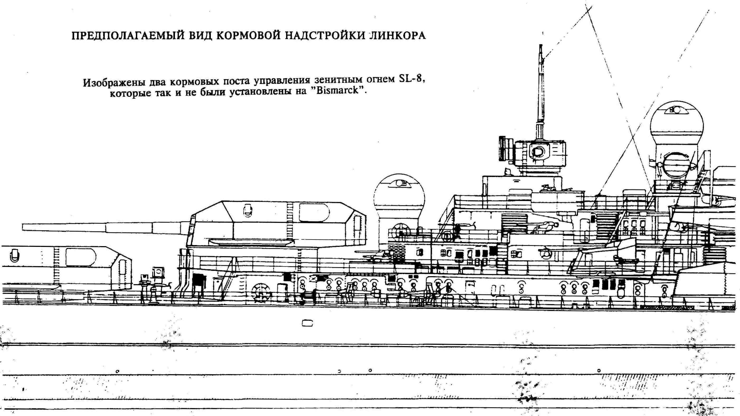 Вентиляционные отверстия в барбете башни "Bruno" уменьшены и получили защиту от брызг; раструб кормового вентилятора левого борта развернут к корме; два больших вентиляционных окна с обеих сторон надстройки (приток и отток воздуха из машинного отделения) получили защитный кожух, исключающий попадание брызг; большие вентиляционные люки с обеих сторон надстроек в районе катапульт и крана закрыты примерно до 1/3 высоты; по обеим сторонам катапульты установлены рабочие мостики; снят 10,5-метровый дальномер башни "Anton", образовавшиеся отверстия заглушены броневыми листами. В марте 1941 на корабль был установлен носовой 7-метровый дальномер, а в конце апреля два одиночных 20-мм автомата на прожекторной площадке башенноподобной надстройки заменены счетверенными "фирлингами" (общее число 20-мм стволов достигло 18). Хуже обстояло дело с поставками стабилизированных ПУАЗО. Перед выходом на операцию "Рейнюбунг" на "Bismarck" отсутствовали кормовые посты. Чтобы хотя бы частично компенсировать отсутствие систем управления зенитным огнем, на "Bismarck" установили два сухопутных поста аналогичного назначения Kdo.Ger.40 фирмы "Цейе", но они не имели трехкоординатной стабилизации и не защищались даже противоосколочной броней. ![]()