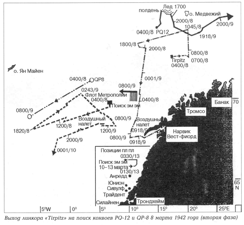 Еще не участвовавшему в настоящих боевых действиях экипажу "Tirpitz" не пришлось долго томиться от бездеятельности. 1 марта Рейкьявик покинул караван PQ-12 в составе 16 транспортов. Дальнее прикрытие осуществляла эскадра вице-адмирала Кертейса: линейный крейсер "Renown" (флагман), линкор "Duke Of Yorck", легкий крейсер "Kenya" и 6 эсминцев. Они вышли из Рейкьявика 3 марта. Днем позже из Скапа-Флоу вышли главные силы Флота метрополии под командованием адмирала Дж. Тови: линкор "King George V", авианосец "Victorious", тяжелый крейсер "Berwick" и 6 эскадренных миноносцев. Рандеву двух эскадр состоялось 6 марта в 200 милях от Ян-Майена. Одновременно из Мурманска на запад отправился "обратный" конвой QP-8. Правда, бушевавший 4 марта шторм разбросал суда последнего, в результате советский лесовоз "Ижора" (2815 брт) был потоплен эсминцем "Friedrich Inn", вместе с отказавшимся покинуть корабль экипажем.