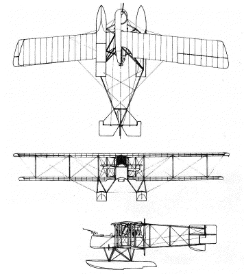 рамный биплан, крылья обтянуты тканью, 2 больших поплавка + 1 малый (под килем) |