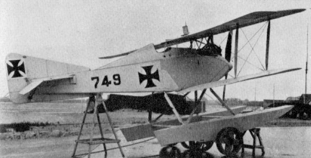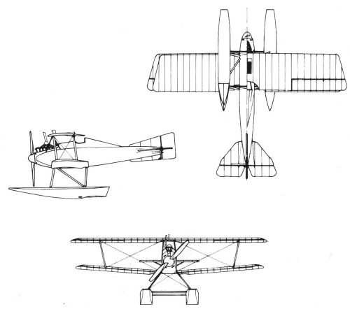 фюзеляжный биплан, крылья обтянуты тканью, 2 больших поплавка |