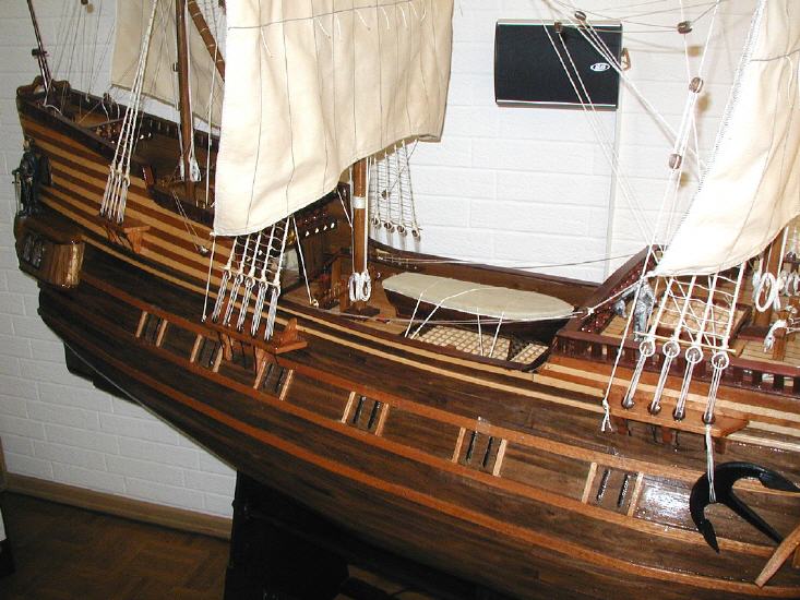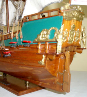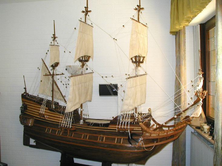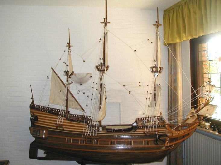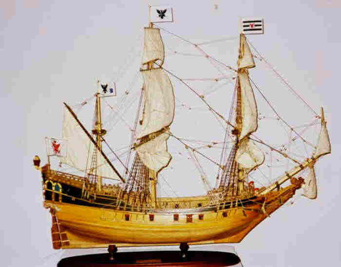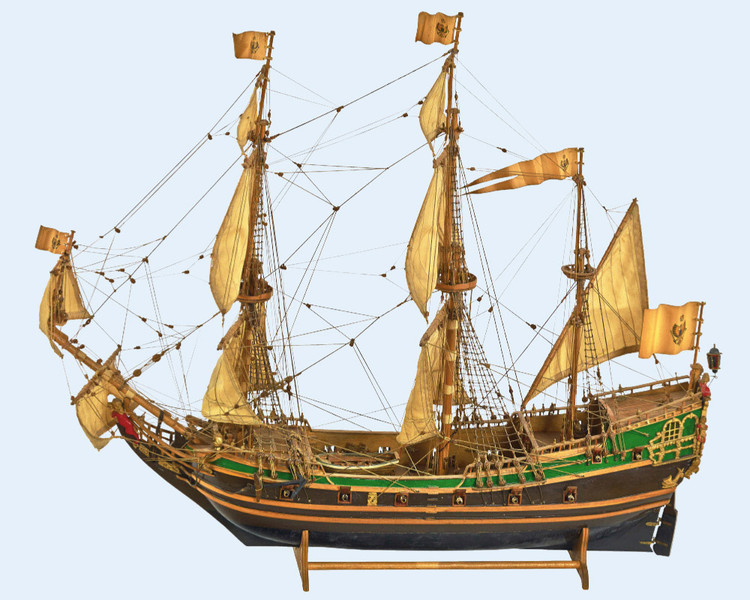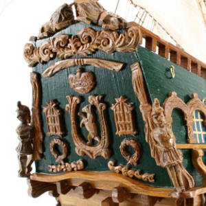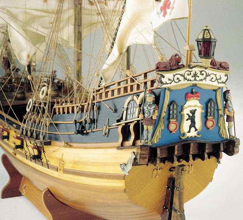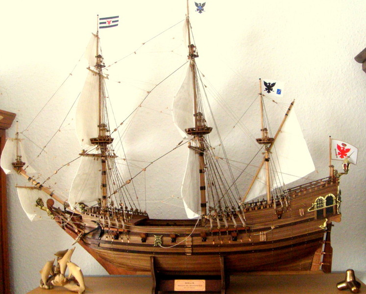 *** ОКРАСКА БРАНДЕНБУРГСКИХ КОРАБЛЕЙ Цветовая гамма была довольно простой. Преобладали темно-коричневый и черный. Пушечные ворота не были оформлены, но внутри они были окрашены в красный. Обшивка кают-кампании, юта и бака - оливково-зеленая, шканцы - матовый коричневый. Фигуры и обрамление: Свитки и части фонаря, а также гальюн были частично позолоченными, частично жёлтыми. Корма была разукрашена наиболее яркими цветами. Большие задние фигуры были окрашены в синий, желтый и красный цвета, их лица имели естественный цвет. Палубы были естественного деревянного цвета. Подводная часть корпуса конопатилась смолой, которая имела почти черный цвет. Поскольку орудия были сделаны из железа, цвет труб был черный, но якоря и другие железные устройства были окрашены. На транце большинства кораблей Бранденбурга размещался герб государства. Это был красный орел на белом фоне.