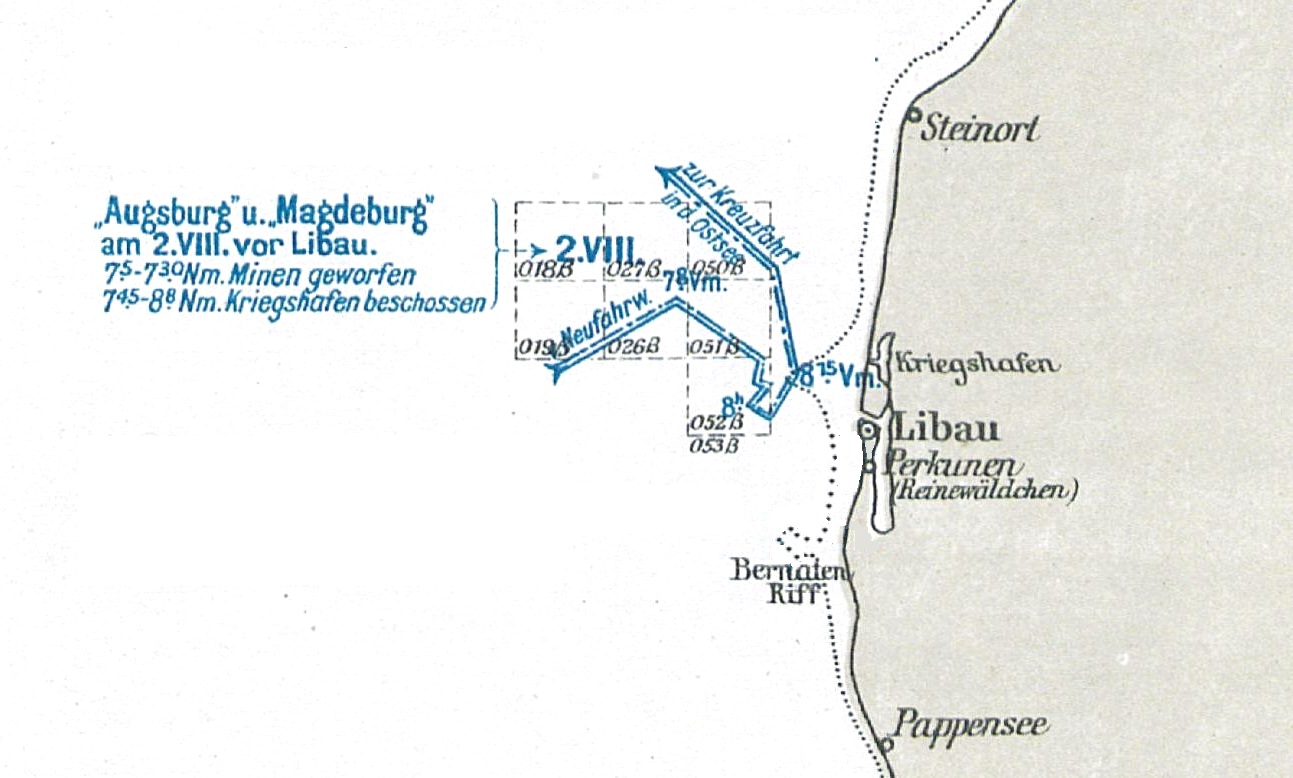 Командир «Augsburg» хотел выставить мины в 20 милях от Либавы, одновременно обстреливая порт на небольшой скорости и не ближе 6 миль к берегу. Намерение командира «Magdeburg» ставить мины с возможно максимальной скоростью и держаться на пределе дальности стрельбы своих орудий, было обусловлено ожиданием с российской стороны артиллерийского противодействия, минных заграждений и подводных лодок - эта точка зрения оказалась ошибочной. Хотя все новости, полученные с российской стороны в последние дни июля, единогласно сообщали об эвакуации Либавы, можно было ожидать определенной артиллерийской защиты и минных заграждений, тем более, что в 5.40 утра «Augsburg» получил радиосообщение главнокомандующего: "Плавучий маяк у причала Либау предположительно заминирован в радиусе 5 морских миль".