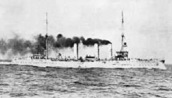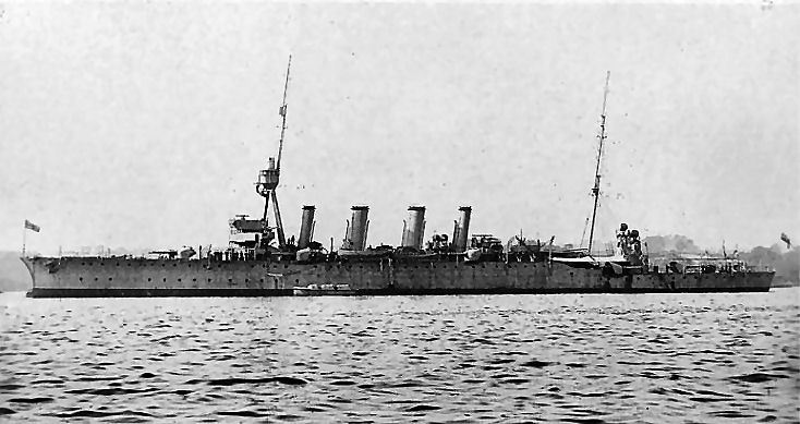 Находясь уже в безнадежном состоянии, крейсер в 13 ч. 20 мин. получил попадание торпедой, взорвавшейся под серединой левого борта. При этом в боевой рубке вышли из действия все приборы для передачи приказаний, за исключением проводки к звуковым сигналам и переговорных труб, проведенных в центральный пост и в торпедное отделение. Командир отдал приказание: „Оставить судно, команде надеть спасательные пояса“ и вышел после этого из рубки. Но это приказание могло дойти только до ближайших боевых постов и было, таким образом, выполнено лишь частично.