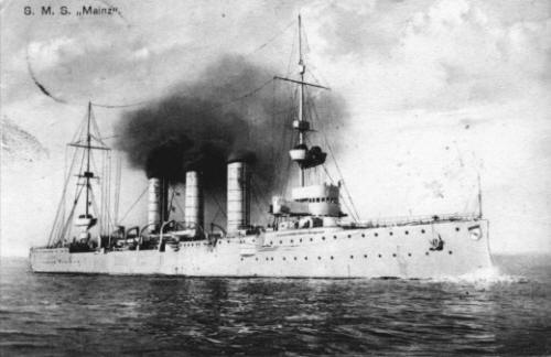 Как только огонь с обеих сторон прекратился, английские корабли очень энергично принялись подбирать из воды уцелевшую команду. По призыву с „Майнца“, у которого до 14 ч. не было еще никакого крена, один из эскадренных миноносцев пристал даже к корме крейсера, чтобы принять раненых. Все раненые, положение которых не казалось безнадежным, были перенесены на миноносец с помощью тех членов команды, которые по расписанию оставались еще на корабле и не бросились в воду. В 14 ч. 10 мин. „Майнц“ накренился на левый борт и тотчас затонул.