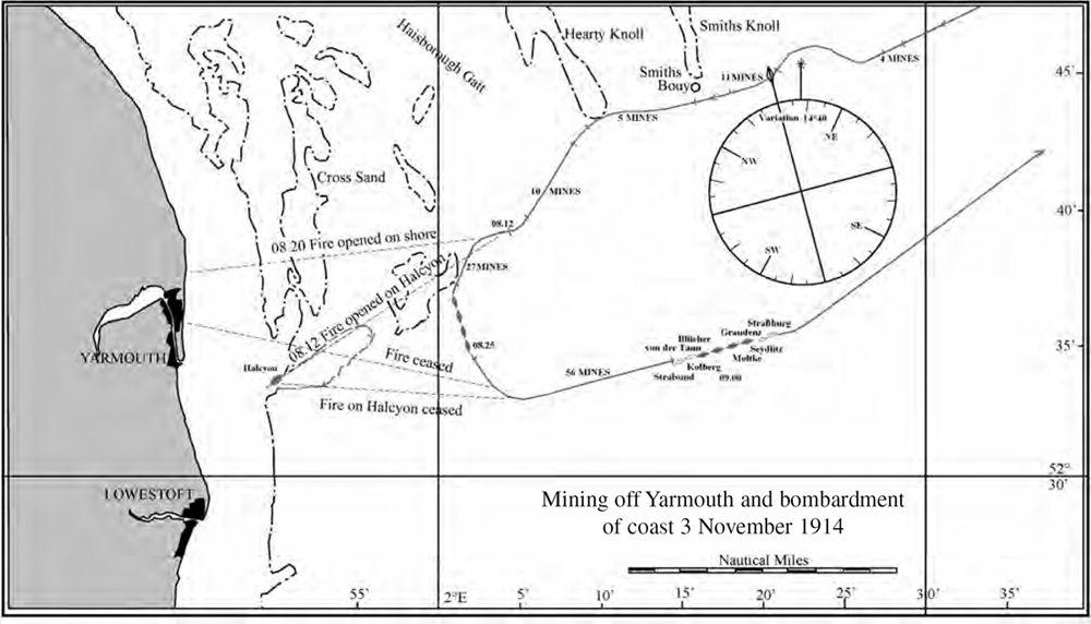 В 8 ч. 30 м. 3 ноября на ярмутском пляже стали рваться снаряды. Погода стояла туманная, и с берега ничего не было видно. Действенность огня по береговым батареям Ярмута с дистанции 13 30020 300 м (72-110 каб.) была ничтожна вследствие тумана и частой перемены курса на случай атак британских подводных лодок. Стрельба немецких кораблей оказалась совершенно безрезультатна, но под её прикрытием легкий крейсер "Stralsund" минировал пути между Ярмутом и Английским каналом. На этом минном заграждении в тот же день погибла британская подводная лодка D-5, спешившая из Ярмута с целью атаки крейсеров противника. Кроме того, "Seydlitz", "Moltke", "Blücher", "Straßburg" и "Graudenz" открыли огонь по британской канонерке "Halcyon" но, так как огонь пяти кораблей по одной мишени с пяти различных направлений не мог быть успешным, не смогли в неё попасть.