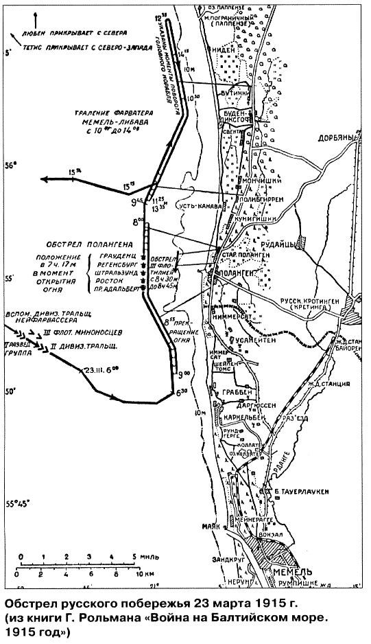 23 марта к Паланге приблизились 2 легких крейсера и эсминцы, три из которых обстреляли Палангу, затем - берег от маяка Пограничного до Бернатена, остальные крейсера держались далеко в море и к берегу не подходили.