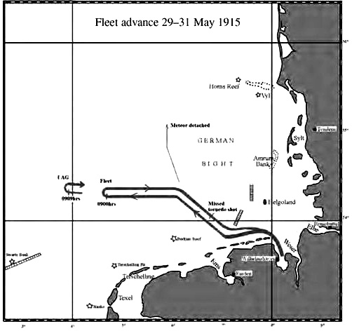 29 мая флот Открытого моря под командованием вице-адмирала фон Поля вышел в Немецкую бухту до района на 50 миль севернее Шиэрмонникога, прикрывая выход в рейд вспомогательного крейсера "Meteor" (боевая задача 28).