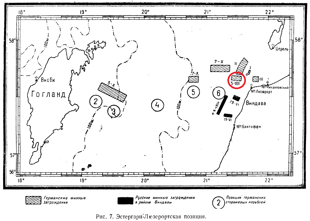 Ночью с 5 на 6 декабря у Лузерорта (вход в Ирбенский пролив) в районе к S от восточного заграждения (у Эстергарна) было дополнительно поставлено 350 противолодочных мин. Участвовали крейсера "Elbing", "Augsburg", минный заградитель "Rügen", миноносцы и тральщики.