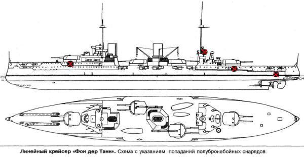 В 16.48 линейные крейсера обеих сторон открыли огонь с дистанции 15400 м (83 кбт.). В период с 17.02-17.05 от снарядов "Von Der Tann" взорвался и погиб британский "Indefatigable". В период с 17.24-17.26 "Derfflinger" и "Seydlitz" потопили "Queen Mary".