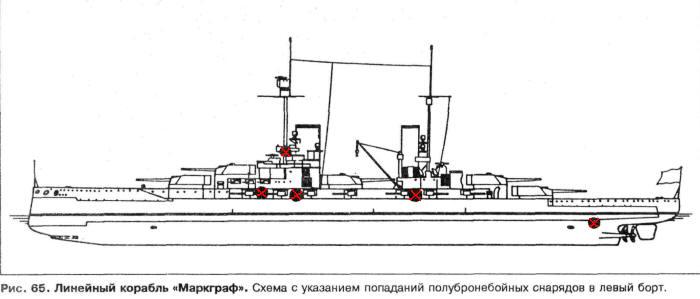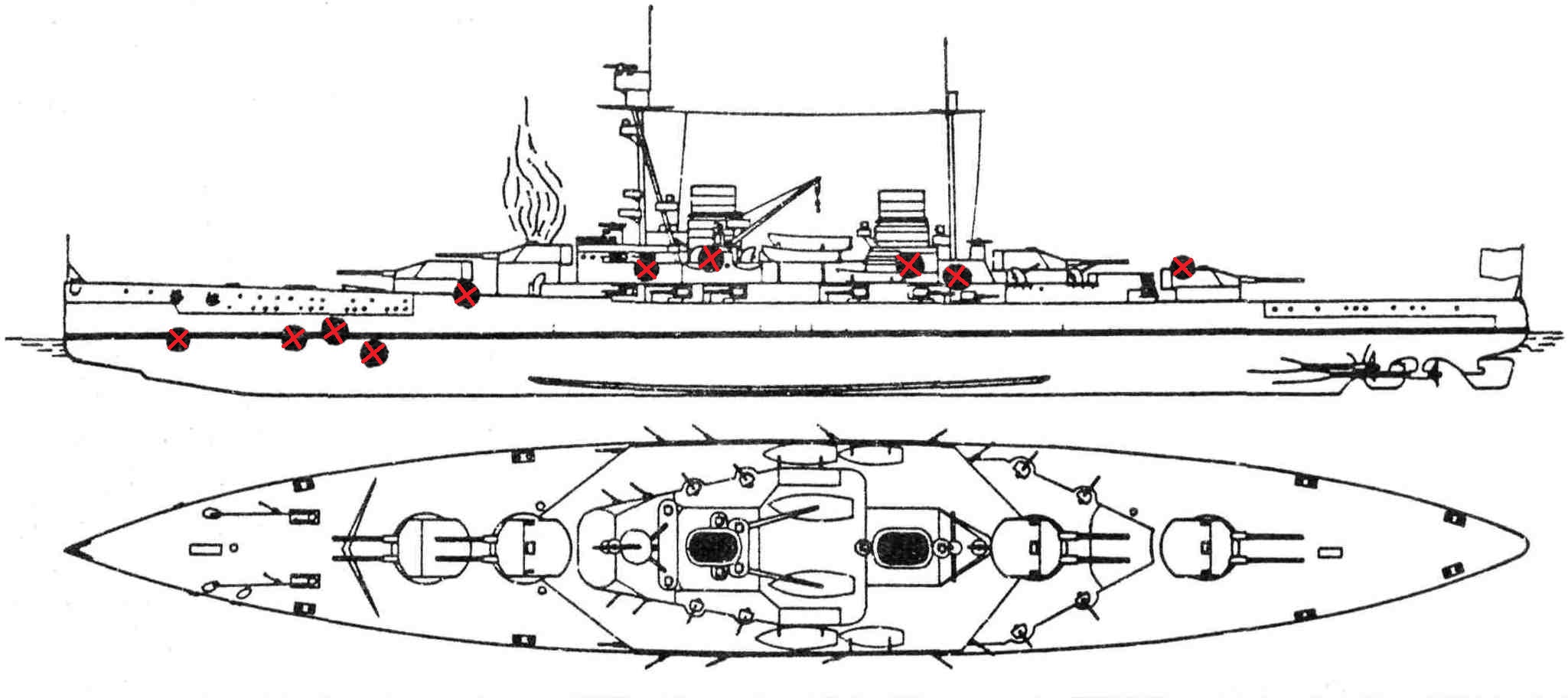 5-му дивизиону пришлось гораздо труднее. Торпедированный флагманский линкор "Marlborough" смотрел в лицо смерти. Офицер с марса вспоминал: “Следы идущих торпед хорошо были видны нам сверху, и их можно было различить на расстоянии мили. Мы тотчас же сообщили на мостик и корабль изменил курс вправо, так что одна торпеда, самая дальняя, прошла впереди; другие две дошли до нас прежде, чем корабль начал разворачиваться. Одна из них прошла так близко от кормы, что мы на марсе потеряли ее из вида. Эта торпеда несомненно попала бы в корабль, если бы он не отворачивал в сторону от нее.