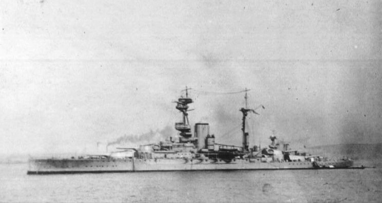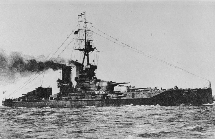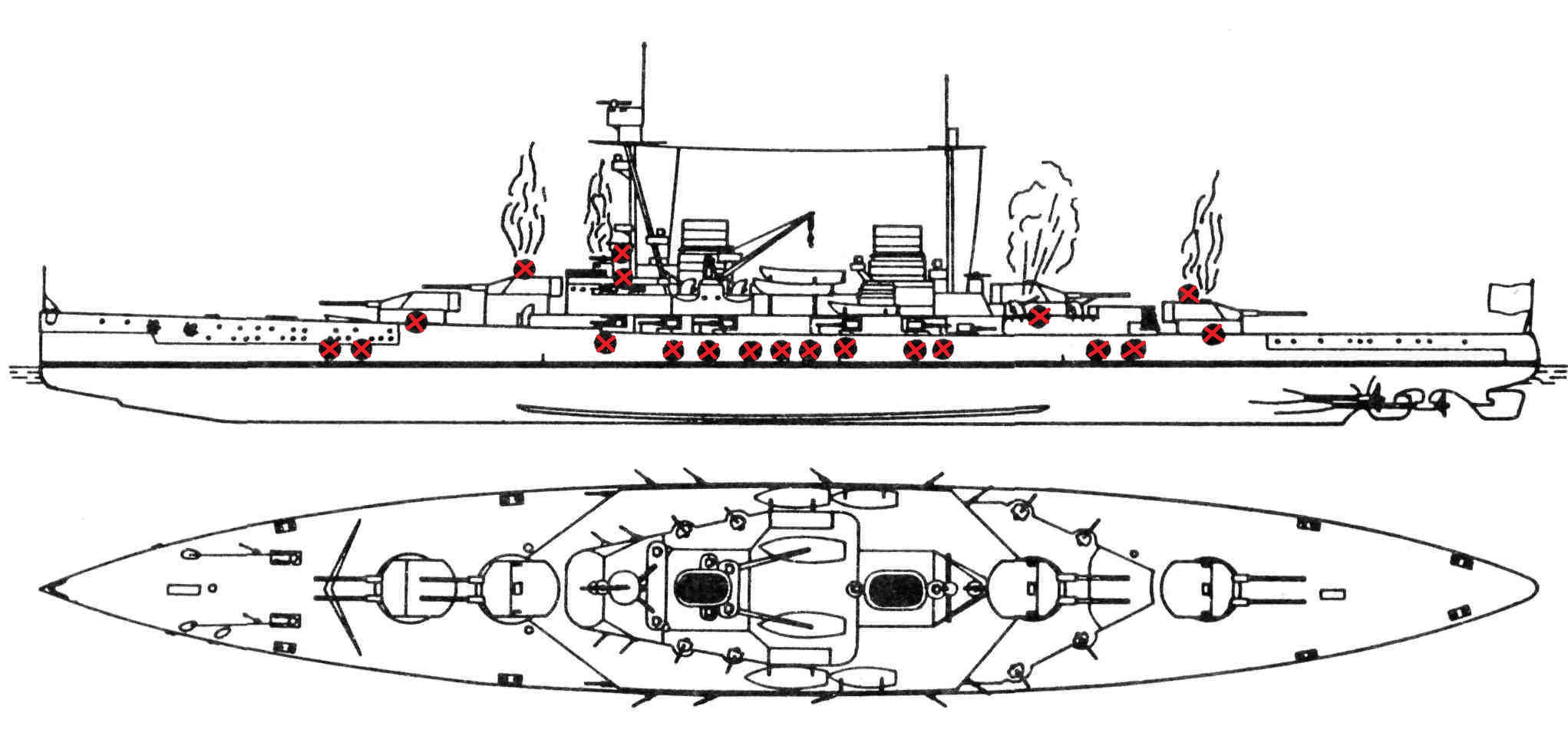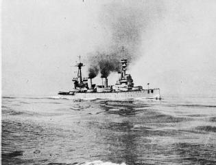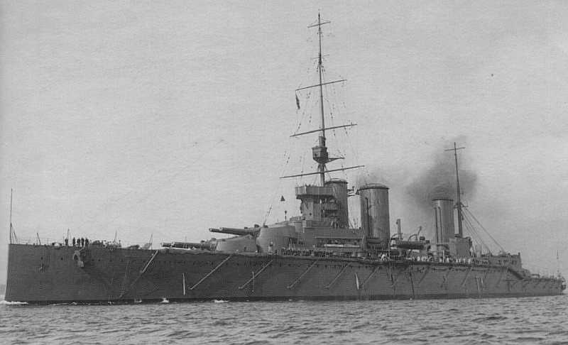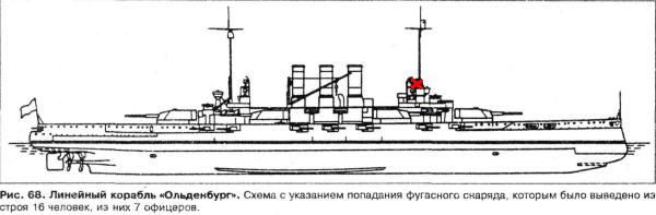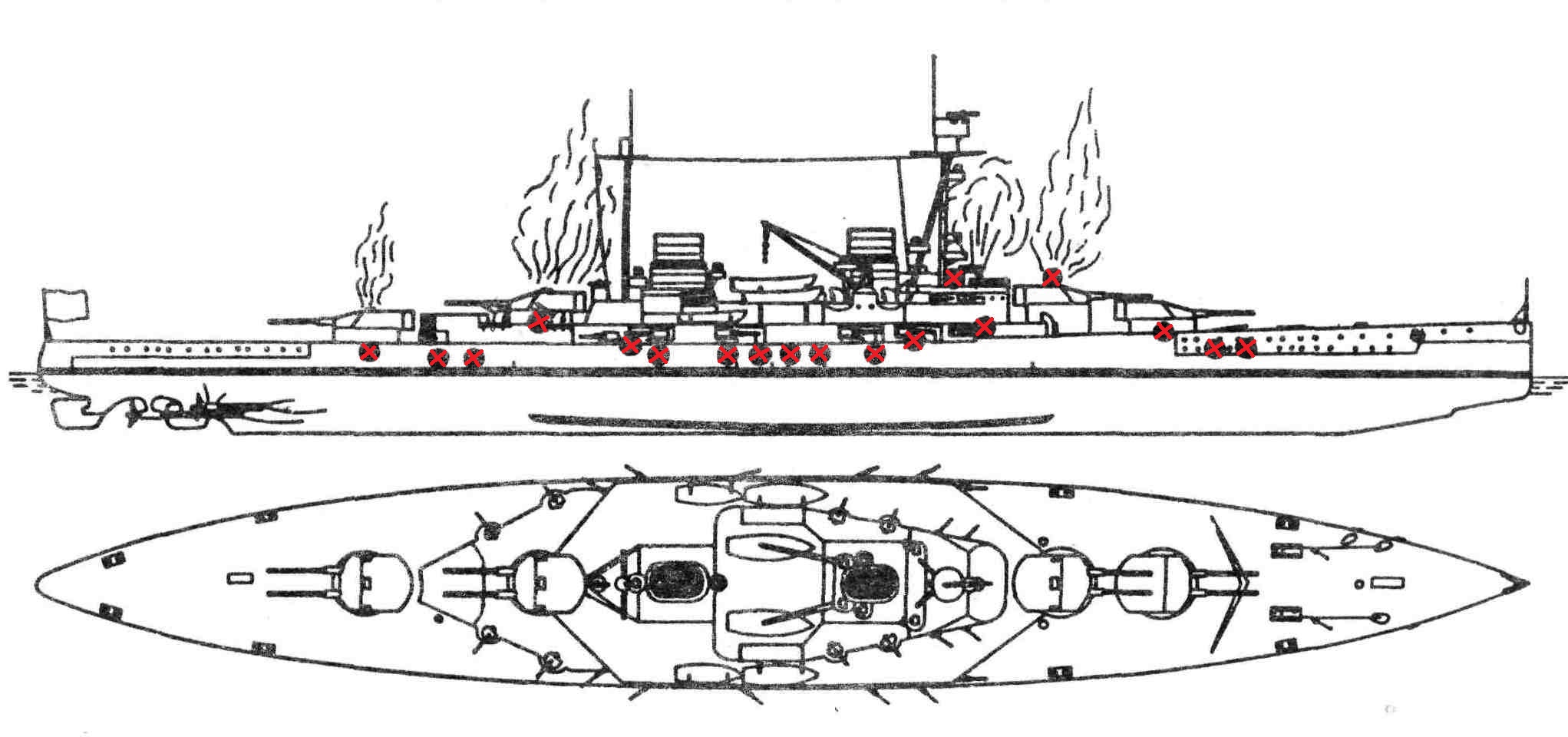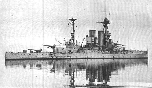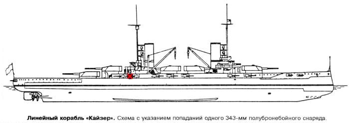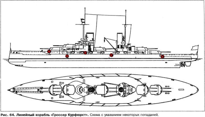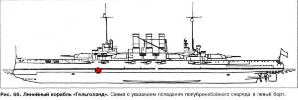 Другая торпеда, которая, как я видел, выскочила на поверхность ярдах в 500 от нас по траверзу, шла прямо на корабль. След ее вел к нашей правой раковине, но, по-видимому, она шла глубже установленной нормы и прошла под днищем корабля. "Marlborough" вышел из строя вправо, а "Revenge" влево. При этом две торпеды прошли рядом с носом и кормой. Сигнальщики "Hercules" тоже сообщили о приближении торпед, линкор повернул на шесть румбов влево, и дредноут и торпеды пошли параллельно. "Agincourt" аналогичным маневром уклонился от двух торпед, которые прошли параллельно левому и правому бортам. Линкорам этой бригады удалось уклониться от девяти торпед. Этому способствовал ряд факторов — состояние моря и ясно видимые следы торпед.