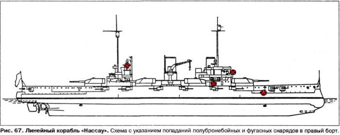 Общее число орудий Гранд-Флита калибром 305 мм и выше равнялось 344, из них в бортовом залпе 332. На германском флоте общее число орудий 280-мм калибра и выше 244, из них в бортовом залпе 212. Вес бортового залпа Гранд-Флита равнялся 177948 кг против 75074 кг германского флота.