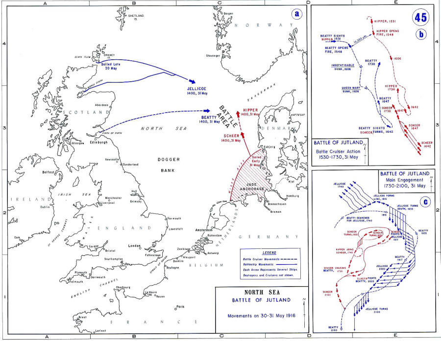 Адмирал Джеллико, не располагавший пока сведениями о месте, курсе, полном составе сил и боевом порядке главных сил немцев, без чего он не мог определить боевой порядок Гранд-Флита, запросил эти данные у Битти. Последний около 19.00 сообщил, что линейные крейсера противника находятся на юго-востоке.