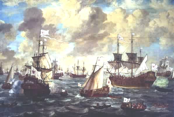 Великий курфюрст принимает парад флота, 1684 г. Слева "Friedrich Wilhelm zu Pferde", в центре яхта "kurfürstliche Große Jacht", справа "Markgraf von Brandenburg" - захваченный у Испанцев "Carolus II" (на картине ещё с испанским гербом (позолоченная конная статуя Карла II, на баке кто то держит испанский флаг), в далеке справа "Churprinz", в центре "Roter Löwe" и "Dorothea", крайняя слева - яхта "Bracke", за ней - "Windhund" и "Berlin".