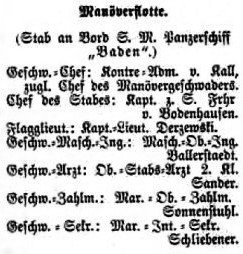 | флагман Badenвице-адмирал фон Калль (von Kall), нач. штаба корветтен-капитан фон Боденхаузен (v. Bodenhausen) |