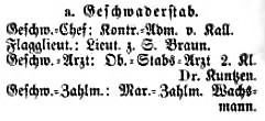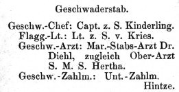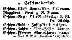 22 мая эскадра под командованием контр-адмирала Карла Фердинанда Батча вышла из Вильгельмсхафена. В её штаб вошли: командир - начальник штаба Адмиралтейства контр-адмирал Бач (Batsch), начальник штаба - корветтен-капитан Шрёдер (Wilhelm Schröder), флаг-офицер - лейтенант-цур-зее Криз (Kries), врач эскадры - штабврач ВМФ доктор Хюте (Dr. Hüthe), эскадренный машинный инспектор - старший нженер Бюддинг (Büdding). В начале июня в Гибралтаре к эскадре также присоединилась канонерка Comet, предназначенная в качестве Средиземноморского стационера.