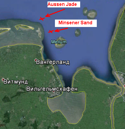 1 июля 1876 на позицию 53°45'20"N/08°05'04"O на глубине 17 м. стал второй маяк - Minsener Sand. 22 мая 1884 Aussen-Jade снова был перемещён на восток, на глубину 15 м, а в 1885 на фарватере в 200 м. к западу от Minsener Sand было обнаружено место 7,5 м глубиной, куда маяк и перевели. 23 июля 1890 Aussen-Jade снова переместили на восток, на позицию 53°48'40"N/08°3'17"O, а 20 июля 1891 - ещё на 250 м. (53°48'41"N/08°03'23"O на глубине 17,5 м.).