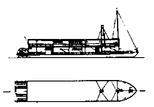 Разборный корпус состоял из 8 герметичных понтонов, доставленных из Европы по отдельности и собранных на месте. Машина и котёл стояли на палубе открыто. В корме размещались двухцилиндровая машина "компаунд" (диаметр 305 мм и 500 мм, ход 1000 мм, диаметр воздушного насоса 140 мм, ход 1000 мм, диаметр циркуляционного насоса 105 мм, ход 110 мм, диаметр питательного насоса 120 мм, ход 300 мм). Котёл был цилиндрический, локомотивного типа, установлен в носовой части единственной топкой вперёд. Рядом с котлом стояла циркулярная пила, чтобы распиливать доставленную на борт древесину. Топливо складывалось на палубе. Главная палуба имела угол водосточного желоба 25 x 25 x 4 мм, была покрыта пихтовыми досками 75 x 25 мм, над стыками понтонов - тиковой доской. Люки на понтонах 2, 3 и 4: 1,85 x 1,25 м, имели деревянные комингсы и крышки внахлест. Верхняя палуба имела палубные балки 150 x 40 мм и 60 x 40 x 4 мм, лонжероны 80 x 40 x 6 мм, доски 75 x 25 мм. Защитный навес - рама из дерева, длиной около 20 м: 13 см брус, покрытый брезентом. В мирное время вооружение не предусматривалось. Было-ли оно установлено после начала войны - не известно.