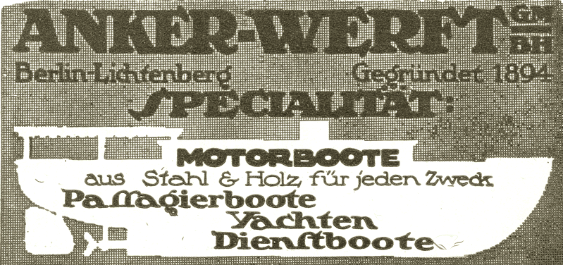 Верфь Anker Schiffswerft und Maschinenfabrik основана в 1894 году на берегу Шпрее в районе Берлина Руммельсбург. Предприятие специализировалось на постройке прогулочных судов, яхт и служебных катеров. Предположительно, существовала до конца второй мировой войны, но, возможно, была закрыта раньше.